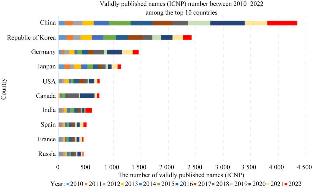 图1 2010–2022年世界主要国家发表的原核微生物新分类单元数量排名