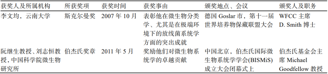 表4 21世纪以来中国微生物分类研究工作者在国际原核微生物分类学相关领域获奖情况