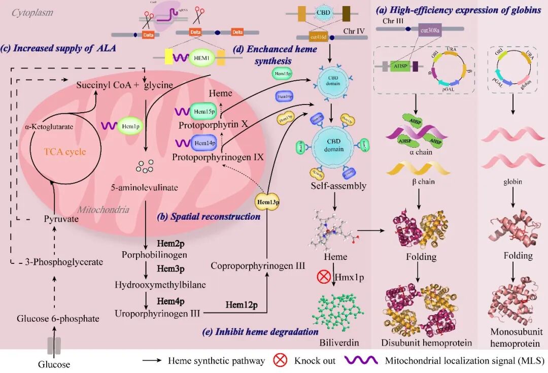 图1 酿酒酵母高效合成血红蛋白和肌红蛋白的代谢改造策略