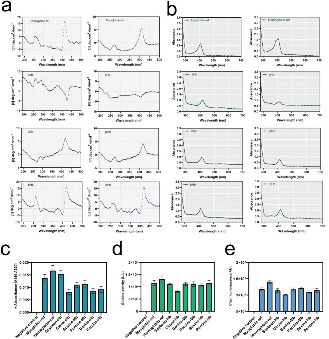 针对这些问题,江南大学食品合成生物学与生物制造团队研究人员利用合成生物学策略构建了血红蛋白和肌红蛋白合成的酿酒酵母底盘细胞(图1)。针对第一个瓶颈,通过比较选择不同的表达策略来强化Hb和Mb中珠蛋白组分的表达水平,确定了高拷贝质粒pESC诱导系统为最佳表达体系(图2)。通过游离表达和整合表达猪或牛的α亚基稳定蛋白(AHSP),最终确定启动子GAL10表达AHSP可以将猪或牛血红蛋白的产量分别提高37.2%和111.1%(图3)。针对第二个瓶颈,通过亚细胞定位和可视化分析确定了Hem1p的线粒体定位信号肽(MLS)位于前54位氨基酸,Hem14p的MLS位于前31位氨基酸,而Hem15p的MLS位于前31位氨基酸(附图2)。针对第三个瓶颈,首先通过在酿酒酵母中筛选最高效的血红素前体ALA的合成途径,确定来源酿酒酵母的C4途径为最佳途径;并通过在酿酒酵母基因组上多位点整合增加C4途径拷贝数,使得胞内血红素的积累量达到0.1 mg/L(图4);在此基础上,同时去除Hem14p和Henm15p的MLS使其定位在细胞质,并与Hem13p在细胞质中组装形成复合体,最终将胞内血红素积累量提升至0.3 mg/L(图4)。最后,在酿酒酵母最适代谢改造菌株HEME-5中,首次实现了牛血红蛋白(11.7 ± 0.4 mg/L)和猪血红蛋白(19.3 ± 2.8 mg/L)的合成;此外,大豆血红蛋白(108.2 ±3.5 mg/L)、三叶草血红蛋白(13.7 ±0.5 mg/L)、牛肌红蛋白(68.9 ±1.6 mg/L)和猪肌红蛋白(85.9 ±5.0 mg/L)在酿酒酵母中也都实现了高效表达。与天然提取的Hb和Mb相比,酿酒酵母合成的不同来源的Hb和Mb均具有一致的光谱特性和相似的生理生化活性(图5)。此研究的成果可为微生物高效合成其他高活性的血红素类蛋白(P450酶、过氧化物酶等)提供可借鉴的方法。
